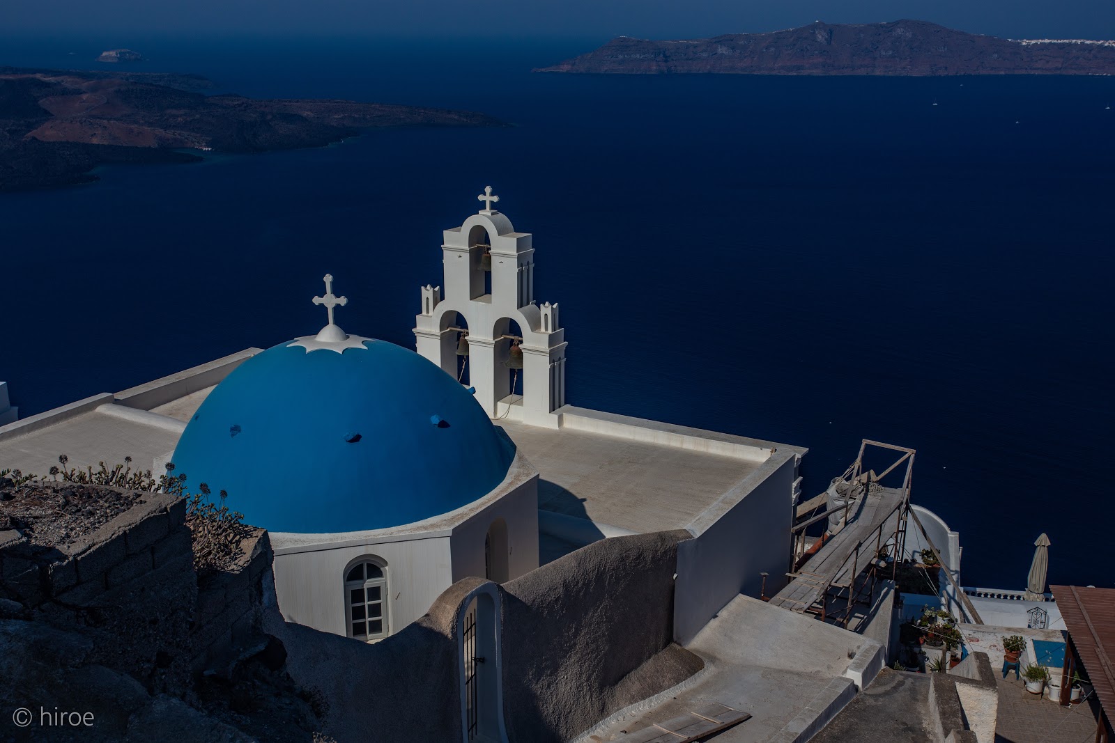 フィロステファニまでずっと上りなので、上からフィラの街を見下ろすことができます。ちょうど教会の鐘が10時を告げるところでした。